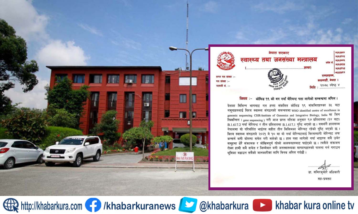 देशका विभिन्न भागबाट गत हप्ता संकलित कोभिड-१९ संक्रमितहरुका ३५ वटा नमूनाहरुलाई विश्व स्वास्थ्य संगठनको समन्वयमा भारतमा ‘जिन स्क्विन्सिग’ गरिएकोमा ९७ प्रतिशतमा बी.१.६१७.२ नयाँ भेरियन्ट र तीन प्रतिशतमा बी.१६१७.१ पुष्टि भएको हो ।