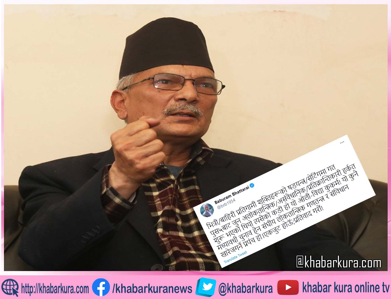 ट्वीटमा लेखेका छन्, ‘भित्री-बाहिरी प्रतिगामी शक्तिहरूको षड्यन्त्र-सेटिंगमा गत पुस ५ बाट जुन अलोकतान्त्रिक,असंवैधानिक र प्रतिक्रान्तिकारी हर्कत शुरू भएको थियो त्यसैको कडी हो यो ओली-विद्या कुकर्म । यो कुनै मध्यावधी चुनाव हैन संघीय लोकतान्त्रिक गणतन्त्र र संविधान खारेज गर्ने प्रपंच हो । एकजुट होऊॅ : प्रतिवाद गरौं ।