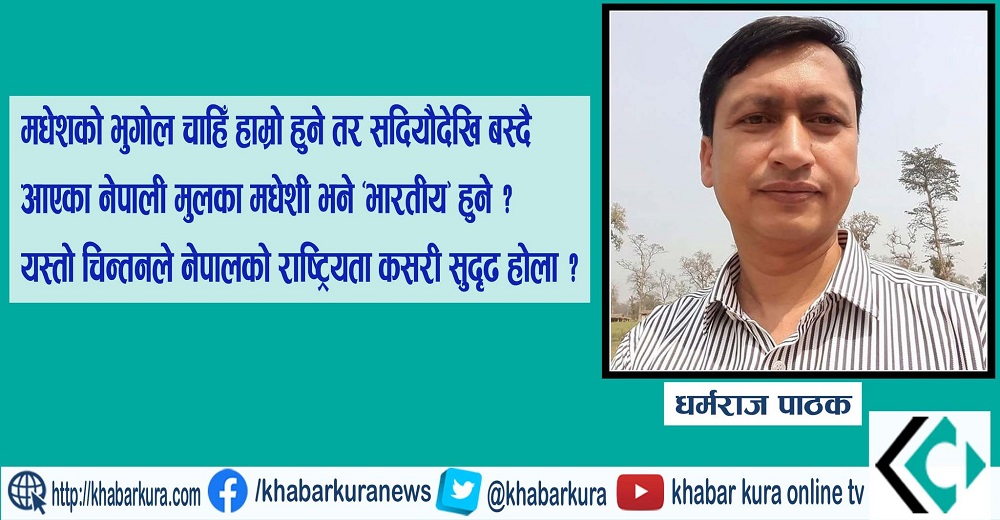 भूगोलको सीमाकै सन्दर्भमा अर्को चर्चा गरौं । सप्तरीको तिलाठीमा वा सुनसरीको भण्टावारीमा भारतीय पक्षवाट सीमा मिचिँदा हाम्रो मन दुख्छ अनि हाम्रो ‘राष्ट्रवाद’ प्रखर रुपमा मुरखरित भएर आउँछ । फेरि त्यहि सप्तरी र सुनसरीमा सदियौंदेखि बस्दै आएका भारतीय जस्ता अनुहार र भेषभुषा भएका नेपालीलाई ‘भारतीय’को नजरले हेर्न थाल्छौ । अनि अघि प्रखर रुपमा मुखरित भएको राष्ट्रवाद स्वात्तै स्खलित भएर आउँछ । मधेशको भुगोलको एक इन्च पनि छोडनु पर्दा हाम्रो मन दुख्छ, मधेशको भुगोल चाहिँ हाम्रो हुने तर सदियौदेखि बस्दै आएका नेपाली मुलका मधेशी भने ‘भारतीय’ हुने । यस्तो चिन्तनले कसरी नेपालको राष्ट्रियता सुदृढ होला त ?