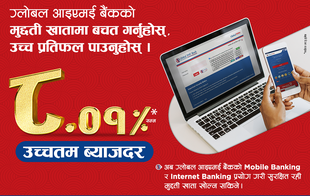 काठमाडौं । ग्लोबल आइएमई बैंक लिमिटेडको मुद्दती बचत खातामा बचत गर्दा उच्चतम् ८.०१ प्रतिशतसम्म ब्याज पाइने भएको छ ।