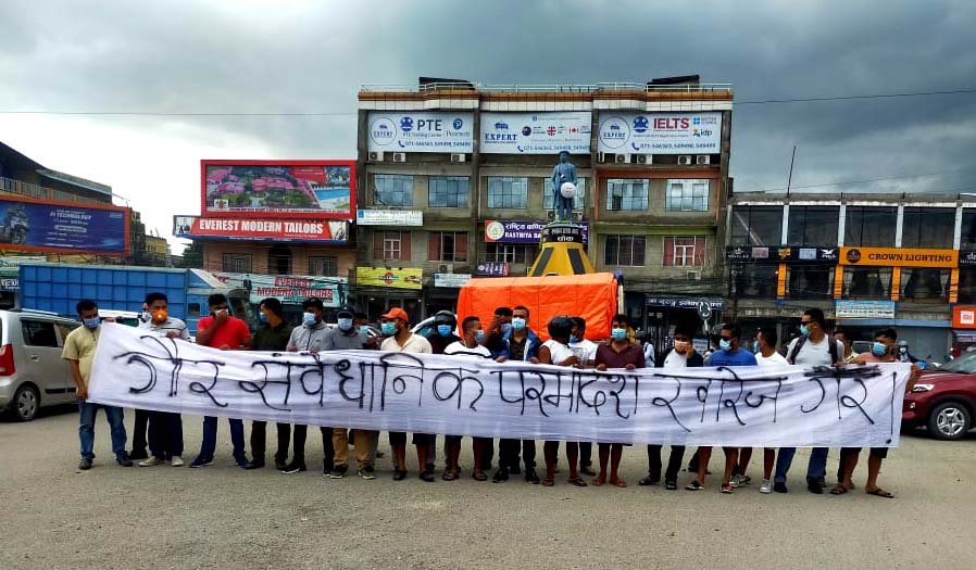 बुटवलको राजमार्ग चौराहमा भेलाभएका प्रदर्शनकारी युवाले ‘गैर संवैधानिक परमादेश खारेज गर’ भन्दै नारावाजी गरेका छन् ।