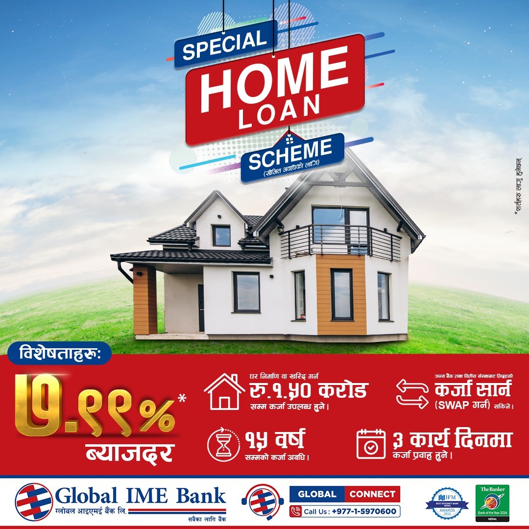 काठमाडौं । ग्लोबल आईएमई बैंक लिमिटेडले ७.९९ प्रतिशत (प्रिमियम सहित) आकर्षक ब्याज दरमा विशेष आवास कर्जा योजना ल्याएको छ ।