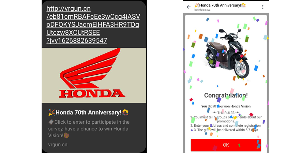 काठमाडौं । अहिले फेसबुक म्यासेन्जरमा होन्डाको ७० औं वार्सिकोत्सवको शुभकामनासहितको म्यासेज लिङ्क यतिबेला म्यासेन्जरमा आइरहेको छ । लिङ्कमा क्लिक गरेपछि स्कुटर उपहार जितेको सन्देशसहित केही नियमहरू राखिन्छ ।