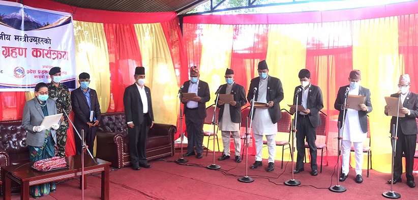 शुक्रबार दिउँसो प्रदेश प्रमुख सीताकुमारी पौडेलले नवनियुक्त मन्त्रीहरुलाई सपथ गराएकी छिन् । कांग्रेसबाट आन्तरिक मामिला तथा कानूनमन्त्रीमा विन्दुकुमार थापा, भौतिक पूर्वाधार, सहरी विकास तथा यातायात मन्त्रीमा कुमार खड्का, शिक्षा, संस्कृति, विज्ञात तथा सामाजिक विकासमन्त्रीमा मेषलाल श्रेष्ठ र पर्यटन, उद्योग, वाणिज्य तथा आपूर्ति मन्त्रीमा मणिभद्र शर्माले शपथ लिएका छन् । यसअघि शिक्षा मन्त्रीको जिम्मेवारी सम्हालेका खड्कालाई भौतिक पूर्वाधार, सहरी विकास तथा यातायातमन्त्रीको जिम्मेवारी दिइएको हो ।