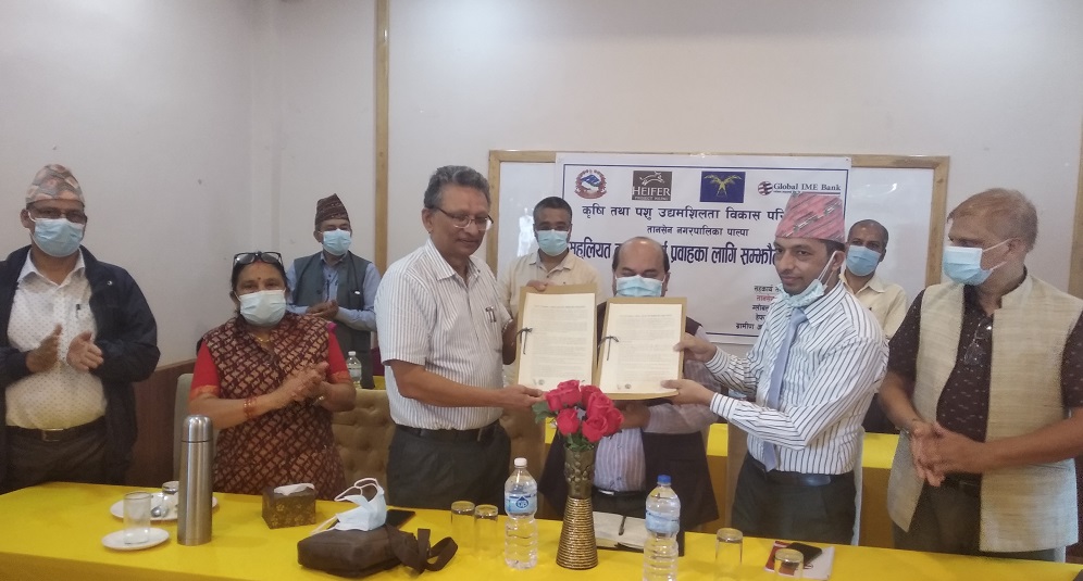 ग्लोबल आइएमई बैंक लिमिटेड तथा तानसेन नगरपालिकाको अगुवाईमा हेफर इन्टरनेशनल नेपाल एवम् ग्रामीण आर्थिक विकास संघसंगको समन्वयमा कृषि अनुदान कर्जासम्बन्धी समझदारी पत्रमाहस्ताक्षर भएको हो । बैंकको तर्फबाट लुम्बिनी प्रादेशिककार्यालयका उप–प्रमुख जोगलाल भुषाल र तानसेन शाखाका शाखा प्रबन्धक वीरबहादुर सारु तथा तानसेन नगरपालिकाका मेयर अशोक कुमार शाहीले उक्त समझदारी पत्रमा हस्ताक्षर गरेका छन् ।