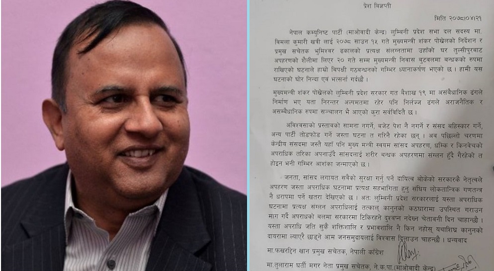 विज्ञप्तिमा अविश्वासको प्रस्तावका सामना नगर्ने, बजेट पेश नै नगर्ने र संसद बहिस्कार गर्ने, अन्य पार्टी तोडफोड गर्ने जस्ता घटना भैरहेको जनाउँदै भनिएको छ, ‘अब पछिल्लो चरणमा केन्द्रीय संसदमा जस्तै यहाँ पनि मुख्यमन्त्री स्वयं सांसद अपहरण, धम्की र किनवेचको आपराधिक तरिका अपनाउँदै सांसदलाई शरीर बन्धक अपहरणमा संलग्न हुँदै गरेको त होइन भन्ने गम्भीर आशंका जन्माएको छ ।’