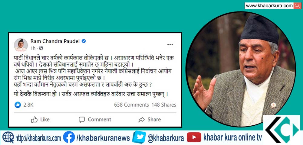 उनले सामाजिक सञ्जालमा लेखेका छन – पार्टी विधानले चार वर्षको कार्यकाल तोकिएको छ । असाधारण परिस्थिति भनेर एक वर्ष थपियो । देशको संविधानलाई समातेर छ महिना बढाइयो । आज आएर त्यस भित्र पनि महाधिवेशन नगरेर नेपाली काँग्रेसलाई निर्वाचन आयोगसँग भीख माग्ने निरीह अवस्थामा पु-याइएको छ । यहाँ भन्दा वर्तमान नेतृत्वको चरम असफलता र लापरबाही अरू के हुन्छ रु यो देशकै विडम्बना हो । सर्वत्र असफल व्यक्तिहरू बारम्बार सत्ता सम्हाल्न पुग्छन् ।