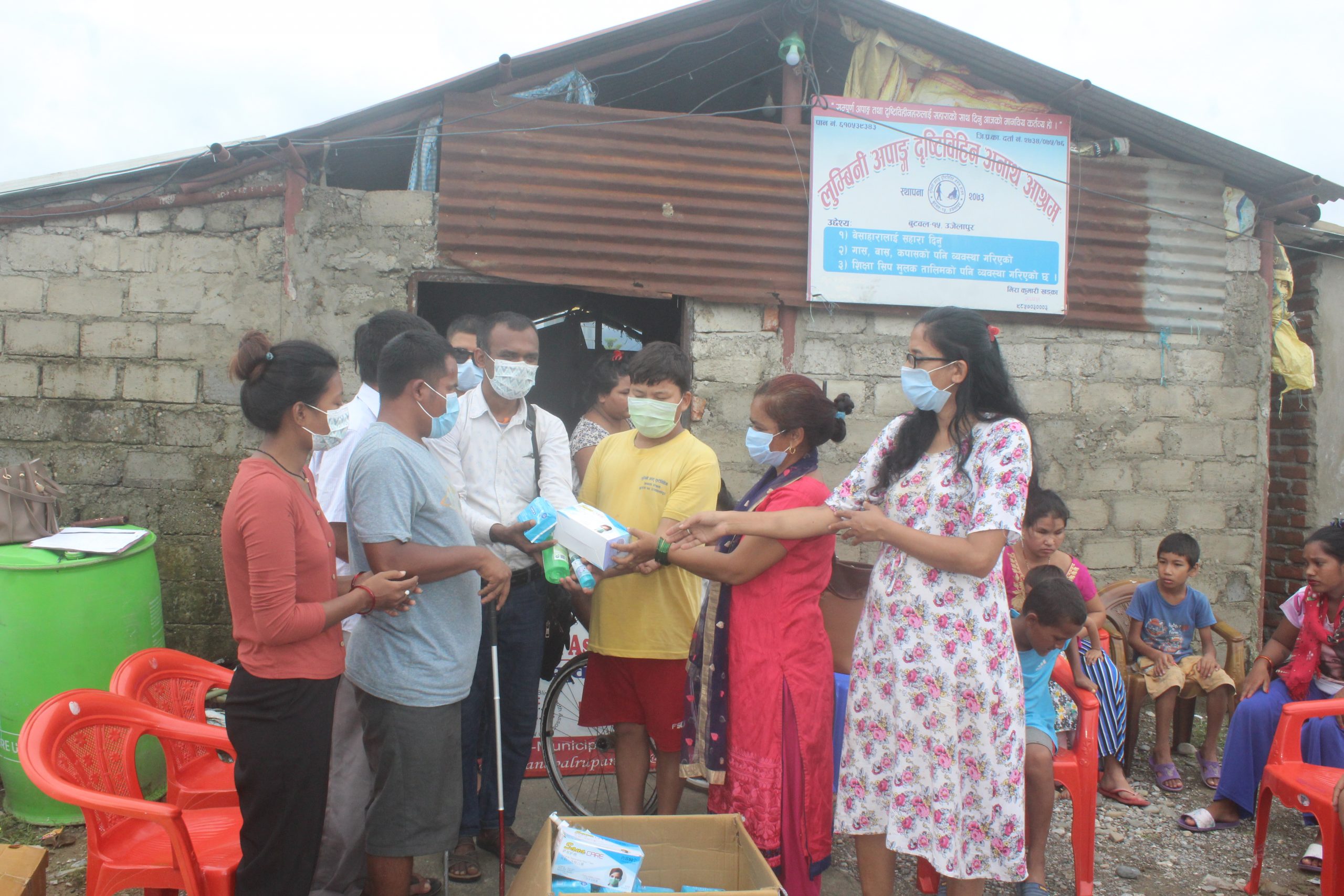 नेत्रहिन युवा संघ नेपाल रुपन्देही शाखा अध्यक्ष टिकाराम पौडेलको संयोजकत्वमा आश्रममा प्रति व्याक्ति १-१ पोका(५० पिस), माक्स, एक÷एक पोका सेनीटाईजर, प्रति आश्रममा २-२ वटा हैन्ड वास सेनिटाईज प्रदान गरिएको हो । यस्तै आश्रममा रहेका महिला तथा किशोरीहरुको लागि प्रतिक जनालाई २-२ थान सेनिटरी प्याड समेत प्रदान गरिएको छ ।