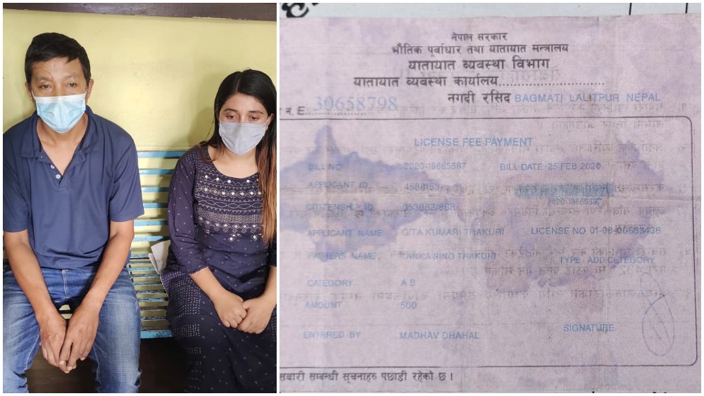 महानगरिय ट्राफिक प्रहरी कार्यालयको टोलिले नक्कली स्मार्ट लाईसेन्स र कर तिरेको नक्कली रसिद समेत बनाईदिने ललितपुर महानगरपालिका–२,बुङमती घर भई हाल जोरपाटी बस्दै आएका प्रेम तुलाधर र खोटाङ ऐंशेलुखर्क गाउँपालिका- ६ घर भई हाल मुलपानी बस्दै आएका कल्पना दाहाल रहेका छन् । पक्राउ परेकाहरुले यातायात कार्यालयहरूबाट जारी गरिने सवारी चालक अनुमति पत्रका नगदी रसिदहरू केही व्यक्तिहरुले सरकारी कागजात दस्तखत किर्ते गरी रकम लिने गरेको भन्ने बिशेष सूचनाका आधारमा ट्राफिक प्रहरीले उनीहरूलाई कागेश्वनरी मनोहरा नगरपालिका वडा नं. ६ मुलपानी स्थित राईजिङ एक्सपोर्ट ड्राईभिङ सेन्टरबाट पक्राउ गरेको ट्राफिक महाशाखाका प्रमुख एसएसपी जनक भट्टराईले जानकारी दिए ।