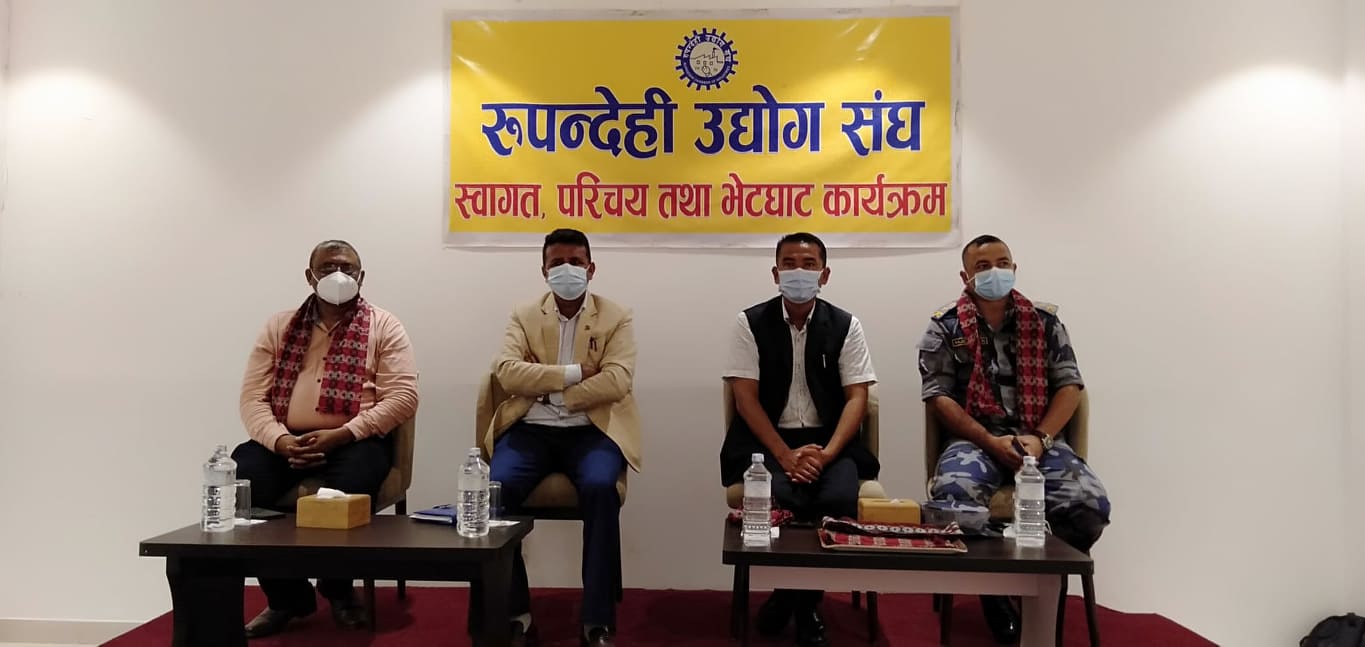 बुटवल । रुपन्देहीका उद्योगीहरुको छाता संस्था रुपन्देही उद्योग संघले रुपन्देहीका प्रमुख जिल्ला अधिकारी अस्मान तामाङ र सिमा सूरक्षा कार्यालय रुपन्देहीका प्रमुख शसस्त्र प्रहरी उपरिक्षक राजेश उप्रेतीसंग स्वागत तथा परिचयात्मक भेटघाट कार्यक्रम सम्पन्न गरेको छ ।