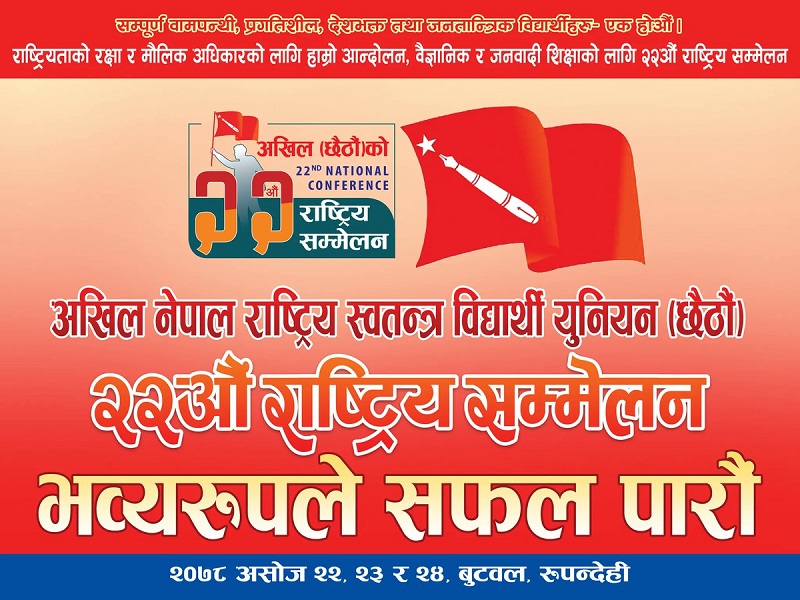 बुटवल । नेकपा मसाल निकट अखिल नेपाल स्वतन्त्र विद्यार्थी युनियन (छैठौँ) को २२ औँ राष्ट्रिय सम्मेलन आजदेखि बुटवलमा सुरु हुँदैछ ।