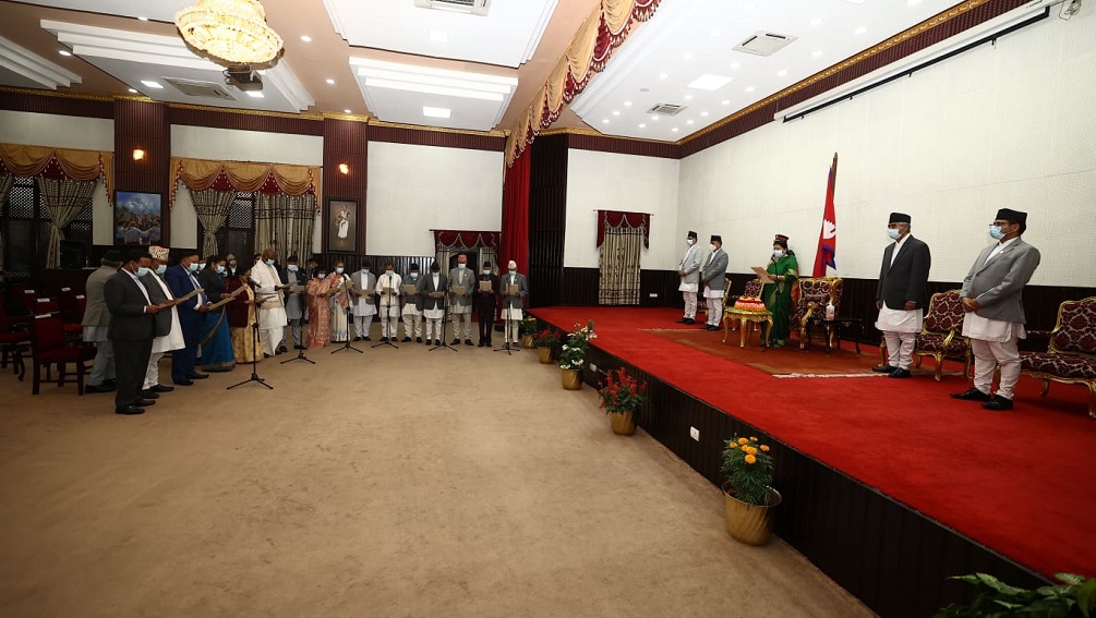 शुक्रबार साँझ राष्ट्रपति भवन शीतल निवासमा आयोजित विशेष समारोहमा राष्ट्रपति विद्यादेवी भण्डारीले मन्त्रीहरुलाई पद तथा गोपनीयताको शपथ ग्रहण गराएकी हुन् ।