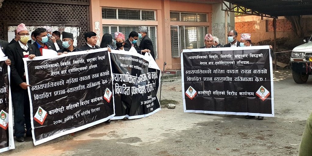 काठमाडौं । प्रधानन्यायाधीस चोलेन्द्र शमशेर जबराको राजीनामा माग्दै नेपाल बार एसोसिएसनले बुधबार पनि धर्ना कार्यक्रमलाई जारी राखेको छ ।