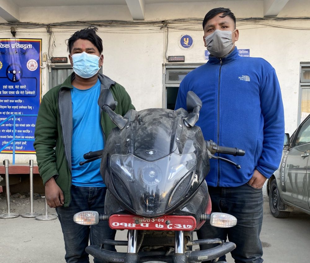 महाशाखाको पीडित सहायता ईकाईबाट सादा पोसाकमा खटिएको टोलीले बौद्धबाट कालो रातो रंङको २२० सी.सी.को प्रदेश ३ -०२-०१४ प ७८३७ नम्बरको पल्सर मोटरसाईकलको वास्तविक नम्वर परिवर्तन गरि नक्कली बिलबुक बनाएर मोटरसाइकल चलाइ रहेको अबस्थामा काभ्रे पाँचखाल- ४ घर भई बालाजु बस्ने ३० वर्षिय दिलिप राई चालक र पछाडी सवार गोरखा पालुङटार – ९ बस्ने २५ वर्षिय नबीन कोईरालालाई मोटरसाइकल सहित नियन्त्रणमा लिएको महाशाखाका प्रमुख प्रहरी वरिष्ठ उपरीक्षक जनक भट्टराईले जानकारी दिएका छन् ।