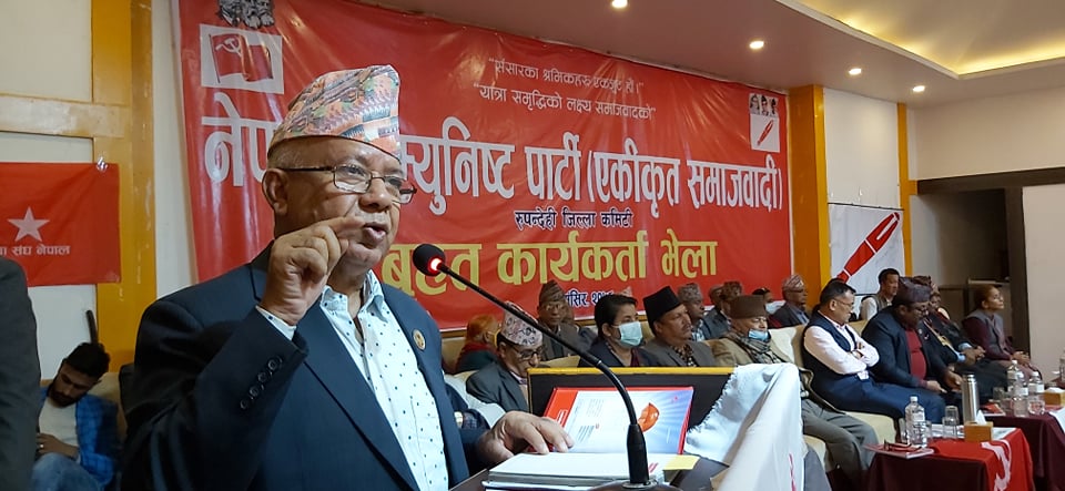 अध्यक्ष नेपालले एमाले निर्माणमा आफ्नो ठुलो योगदान रहेको दाबी गर्दै केपी ओलीले नेतृत्व सम्हाले देखि पार्टीलाई दक्षिणपन्थी बनाएको आरोप लगाए । ‘मार्क्सवादी प्रशिक्षण छैन, समाजवादी बहस छैन, राजावादीहरुसँग साँठगाँठ गरेको छ, रातविरात विदेशी कुटनितिक व्यक्ति संग भेट्या , यसरी कम्युनिष्ट पार्टी बन्छ ?’ अध्यक्ष नेपालले प्रश्न गरे, -‘कम्युनिष्ट पार्टीको महाधिवेशनको निर्णय मान्दिन, संसदलाई मान्दिन भन्ने मान्छे कम्युनिष्ट हुन सक्दैन ।’ उनले नारायणी किनारमा तमासा र कुम्भमेला गरेर निरंकुशता कायम गर्दै एमालेले कम्युनिस्ट विचार परित्याग गरेको र पार्टीलाई केपीको प्राईभेट कम्पनी बनाइएको टिप्पणी गरे ।