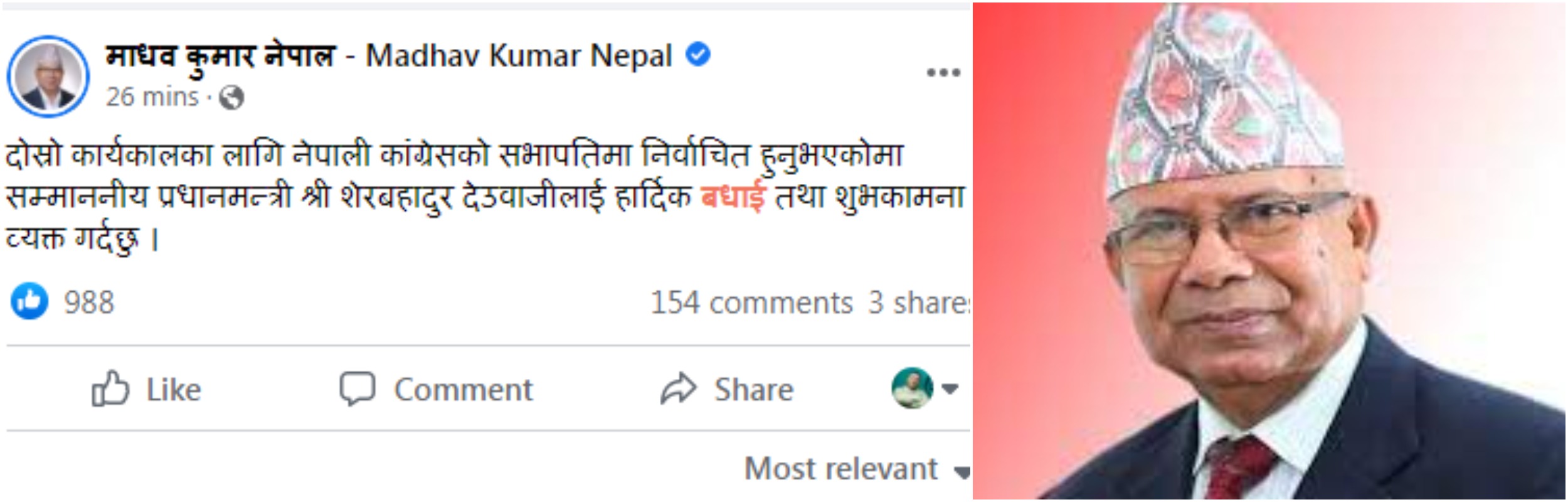 नेपालले फेसबुकमा लेखेका छन्, ‘दोस्रो कार्यकालका लागि नेपाली कांग्रेसको सभापतिमा निर्वाचित हुनुभएकोमा सम्माननीय प्रधानमन्त्री श्री शेरबहादुर देउवाजीलाई हार्दिक बधाई तथा शुभकामना व्यक्त गर्दछु ।’