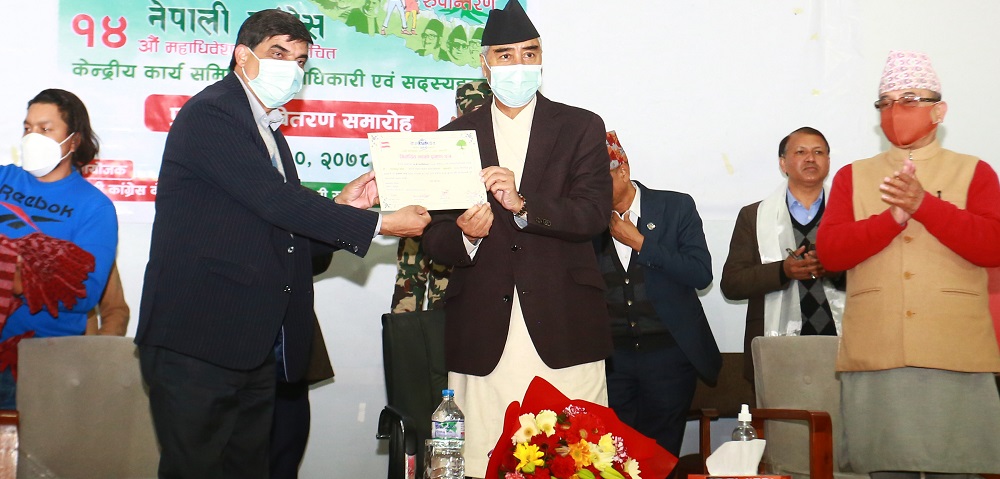 शनिबार पार्टी केन्द्रीय कार्यालय सानेपामा आयोजित १४ औं महाधिवेशनबाट निर्वाचित पदाधिकारी तथा केन्द्रीय सदस्यहरुको निर्वाचित प्रमाणपत्र वितरण समारोहमा बोल्दै सभापति देउवाले आफू पार्टीमा सबैको सभापति भएको र सबैलाई समेटेर उनीहरुको मतको कदर गर्दै पार्टीलाई अघि बढाउने बताएका हुन् ।