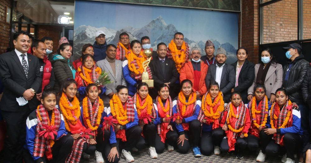 काठमाडौं । एसियन सेन्ट्रल जोन महिला भलिबल च्यालेन्ज कपको बिजेता नेपाली भलिबल टिम स्वदेश फर्किएको छ । बिहिबार बिहान स्वदेश फर्किएका नेपाली खेलाडीहरुलाई त्रिभुवन अन्तराष्ट्रिय बिमानस्थलमा भब्य स्वागत गरीएको छ ।