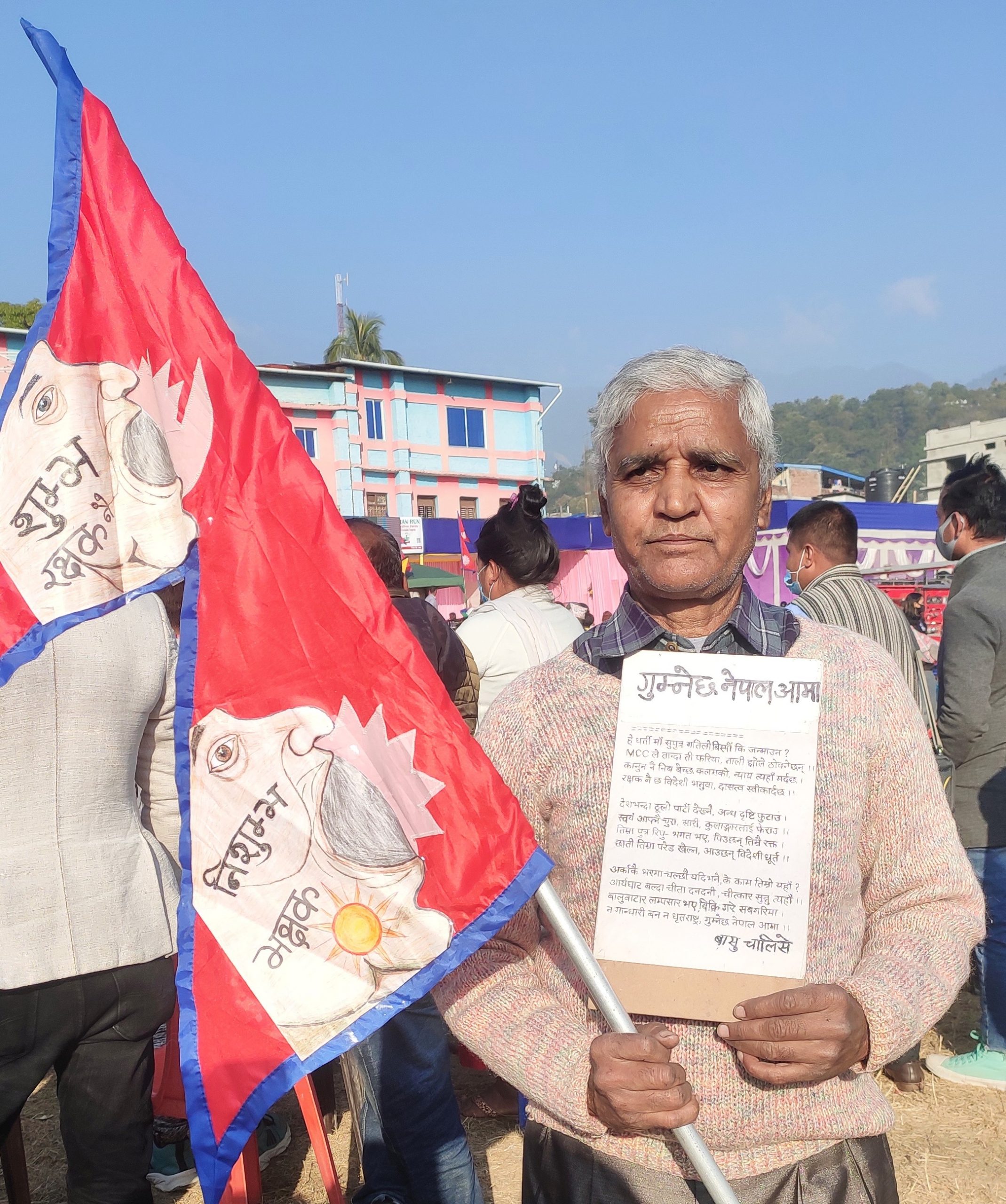 एउटा हातमा नेपालको झण्डा अनि अर्को हातमा प्ले कार्ड । झण्डामा लेखिएको थियो( शुम्भ रक्षक नै निशुम्भ भक्षक अनि प्ले कार्डमा ‘गुम्नेछ नेपाल आमा’ शीर्षकको कविता । त्यही कविताको एक लाइनमा थियो ‘नो एमसीसी’