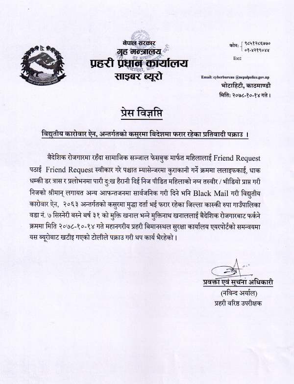 प्रहरी प्रधान कार्यालयको साइबर ब्युरोले विज्ञप्ति जारी गरेर दिएको जानकारीअनुसार वैदेशिक रोजगारमा रहँदा सामाजिक सञ्जाल फेसबुकमार्फत ललाइफकाई, धाक धम्की डर त्रास र प्रलोभनमा पारेर पीडित महिलाको लिएको नग्न तस्बिर र भिडियो सार्वजनिक गरी दिने भनि धम्की दिएको आरोपमा उनलाई पक्राउ गरेको हो ।