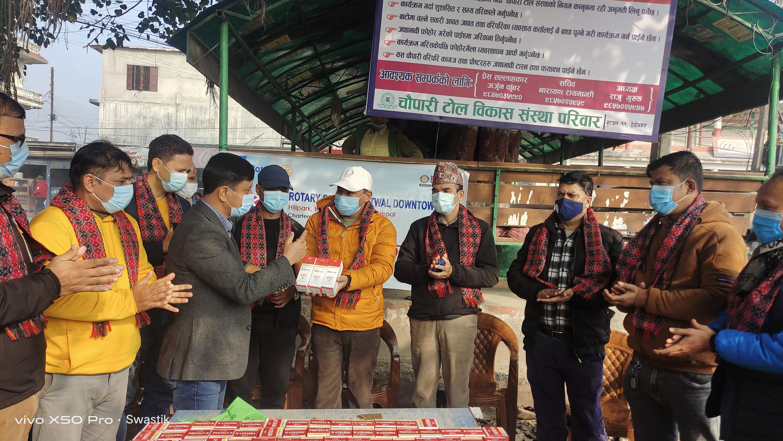 शनिबार देविनगरस्थित चौपारीमा एक समारोहका बिच बुटवल उपमहानगरपालिका वडा नं ११ का वडाअध्यक्ष रामचन्द्र क्षेत्री, क्लबका अध्यक्ष जबिन कक्षपति, एजी जीवन अधिकारीले जि २५ क्लबका अध्यक्ष निर्मल नेपाल, संस्थापक अधयक्ष रमेश कुमार जोशी तथा कबिराज तथा योग अभियन्ता विष्णुहरि आचार्यलाई ५० हजार रुपैया बराबरको औषधि (लाईभ प्रोटेक्ट एच) हस्तान्तरण गरिएको हो ।