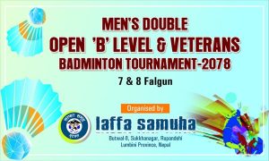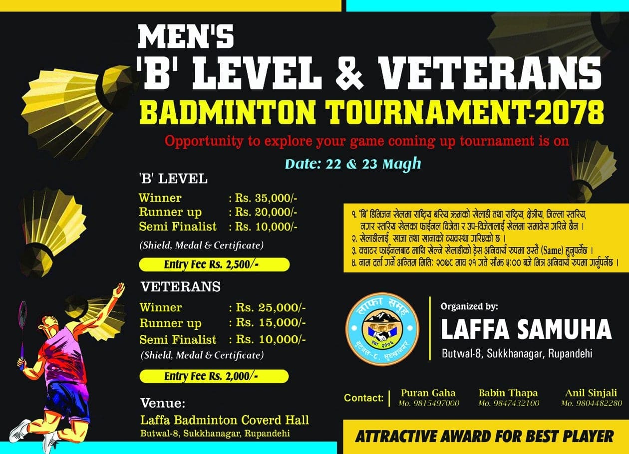 समुहले माघको २२ र २३ गते २ दिने लाफा बि लेभल पुरुष तथा भेट्रान व्याडमिन्टन प्रतियोगिता आयोजना गर्ने निर्णय गरेको थियो ।