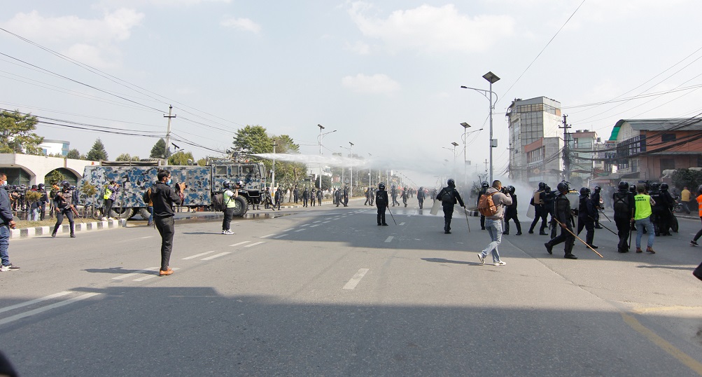 सोही क्रममा प्रहरी र प्रदर्शनकारीबीच झडप भएको छ । झडपमा प्रहरी र केही प्रदर्शनकारी सामान्य घाइते भएका छन् । प्रदर्शनकारीहरू निषेधित क्षेत्रमा प्रवेश गर्न खोजेपछि प्रहरीले पानीको फोहोर प्रयोग गरेको छ ।