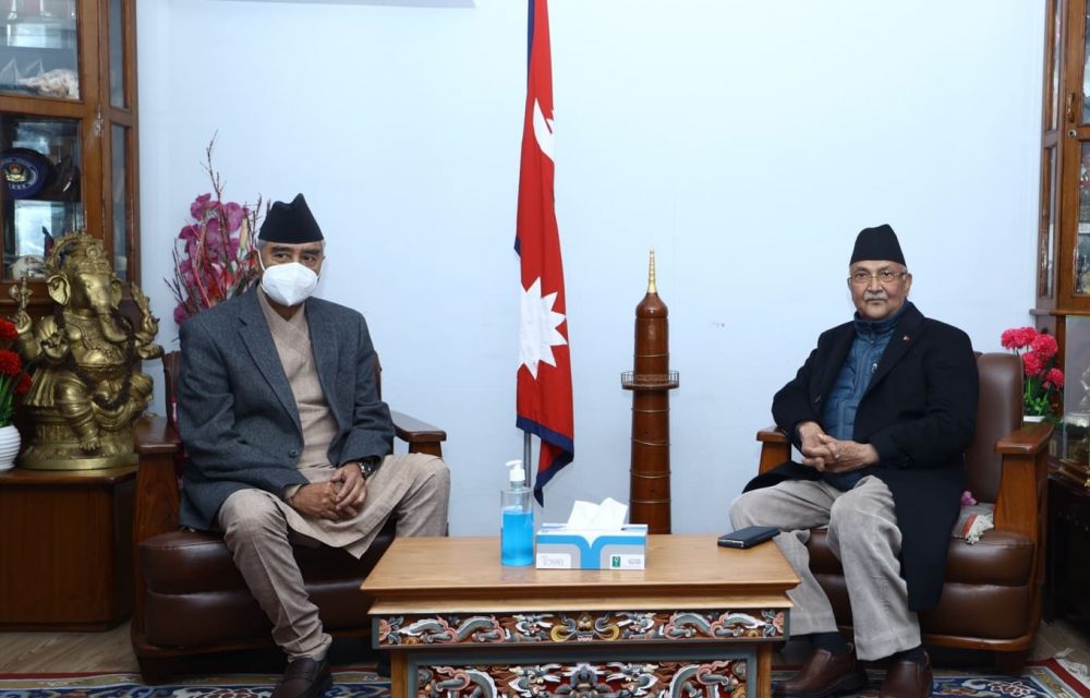 काठमाडौं । प्रधानमन्त्री शेरबहादुर देउवा र एमाले अध्यक्ष केपी शर्मा ओलीसहितको दुई दलका शीर्ष नेताहरुको बैठक सकिएको छ ।
