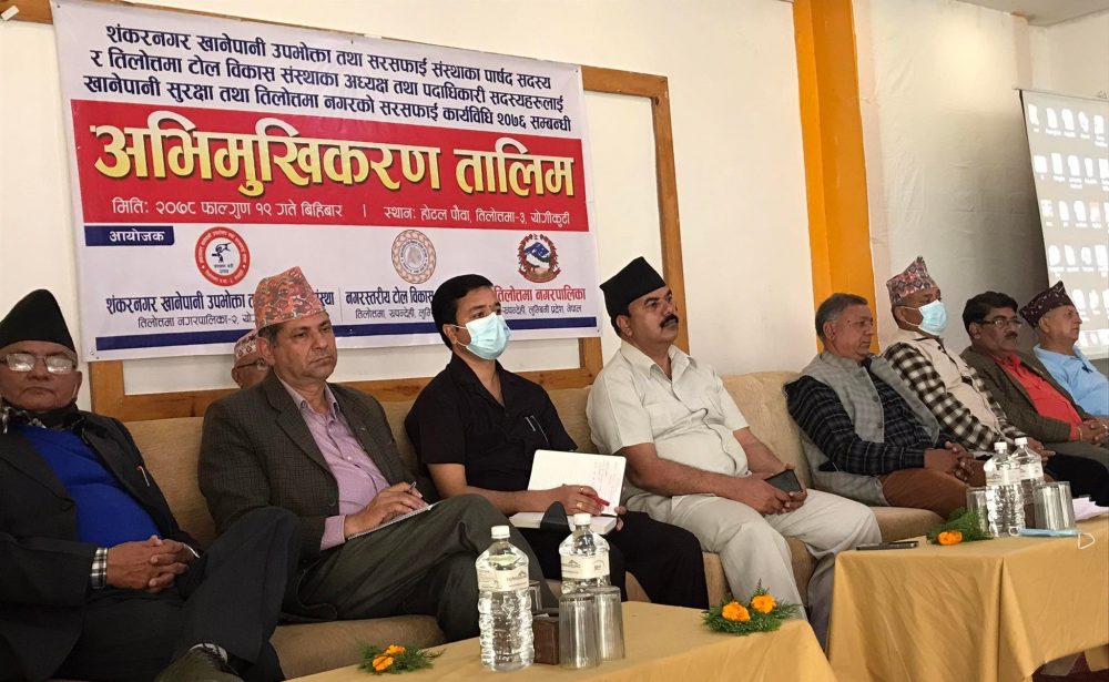 खानेपानी संस्थाका अध्यक्ष झविन्द्र भण्डारीको अध्यक्षता, उपाध्यक्ष डिलबहादुर भट्टराईको स्वागत, सचिव कमला भण्डारीको सञ्चालनमा भएको कार्यक्रममा तिलोत्तमा वडा नं। ३ का वडाध्यक्ष टंकप्रसाद तिवारी, खानेपानी उपभोक्ता महासंघ रुपन्देहीका अध्यक्ष ध्रुव धिताल, नगरस्तरीय टोल विकास संस्था सञ्जालका अध्यक्ष हेमराज पौडेल, नगरपालिकाकी वरिष्ठ सामाजिक परिचालक अल्पा घिमिरे, वातावरण शाखाका गोरखनाथ खनाललगायतले बोलेका थिए ।