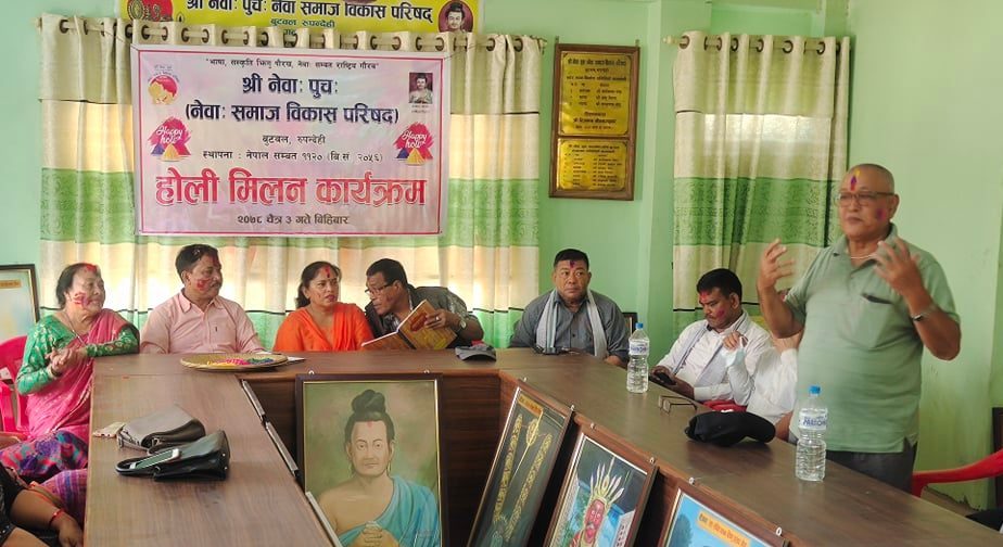 बुटवल । बुटवलमा सहक्रिय नेवाः अगुवाहरुले नेवाः समुदायको संस्कार वैज्ञानिक रहेको दाबी गरेका छन् । श्री नेवा पुच नेवा समाज विकास परिषदले आज बुटवलमा आयोजना गरेको होलि मिलन कार्यक्रममा उपस्थित नेवाः अगुवाहरुले नेवाः समुदायको खानपान देखि चाडवाड सबै वैज्ञानिक आधार जोडिएको बताएका हुन् । उनीहरुले आफ्नै भाषा, आफ्नै लिपी, आफ्नै संस्कार र रिवाज रहेपनि एकताबद्ध भने हुन नसकेको औंल्याए । सहभागीहरुले नेवारहरुको हक हित र पहिचान संरक्षणका लागि समुदयका अगुवाहरु राजनीतिक विचार भन्दा माथि उठ्नु पर्ने सुझाव दिएका छन् ।