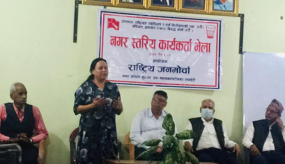 शनिवार राष्ट्रिय जनमोर्चा बुटवल उपमहानगरपालिकाको नगर भेलालाई सम्बोधन गर्दै उपाध्यक्ष पौडेलले ५ दलिय गठबन्धनमा आफ्नो पार्टी नरहेको अबस्थामा पनि प्रतिगमनको खतरा रोक्न चुनावी मोर्चालाई सधै खुल्ला राखेको धारणा राखिन् । उनले राष्ट्रीयता, गणतन्त्र र धर्मनिरपेक्षतालाई खारेज गर्ने उद्देश्यले भैरहेका प्रतिगमनकारी शक्तिलाई परास्त गर्दै संविधानको रक्षा गर्नु अहिलेको प्रमुख राजनीतिक मुद्दा बन्नु पर्ने कुरामा जोड दिइन् ।