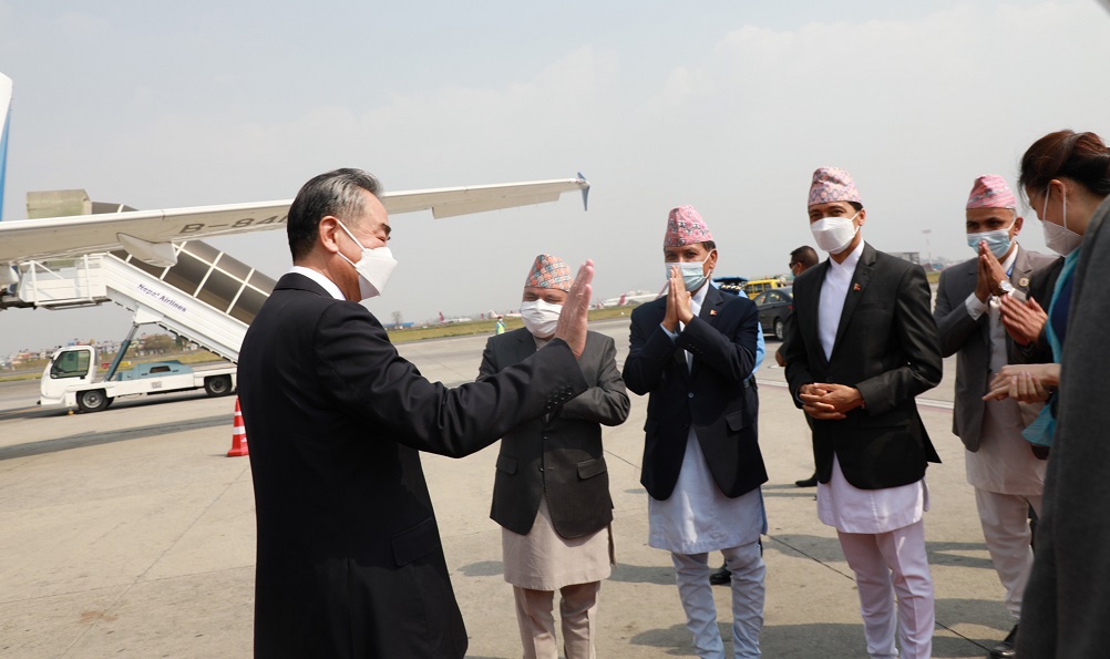 परराष्ट्रमन्त्री डा नारायण खड्काको मैत्रीपूर्ण निमन्त्रणामा नेपाल भ्रमणमा आउनुभएका विदेशमन्त्री वाङ १९ सदस्यीय प्रतिनिधिमण्डलको नेतृत्व गर्दै शुक्रबार यहाँ आइपुग्नुभएको थियो ।