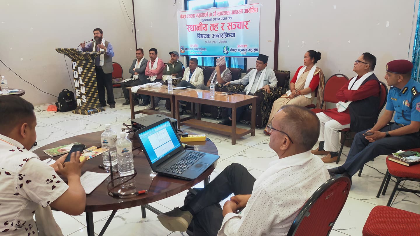 कार्यक्रममा महासंघ रुपन्देहीका पूर्वअध्यक्ष डिआर घिमिरेले कार्यपत्र प्रस्तुत गर्दै स्थानीय तहमा बेथितीहरु देखा परेको बताउँदै यस्ता मुद्धामा सञ्चारमाध्यमले ध्यान दिनुपर्ने बताए । कार्यत्रपत्रमाथी टिप्पणी गर्दै बरिष्ठ पत्रकार माधव नेपालले स्थानीय तहका बारेमा समाचार लेख्दा काँग्रेस, एमाले माओवादीको विल्ला भिराउने प्रचलन रहेको बताए ।