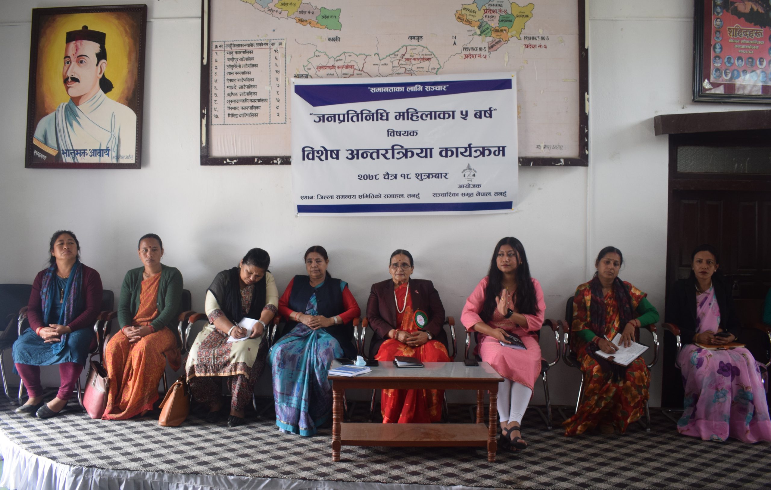 तनहुँका महिला जनप्रतिनिधिले अब उपमा नभएर प्रमुख पदमा उम्मेद्वार दिने उद्घोष गरेका छन् । वडासदस्यले वडाध्यक्ष र स्थानीय तहको उपप्रमुखले प्रमुखमा दाबी गर्ने उद्घोष गरेका हुन् । शुक्रबार सञ्चारिका समूह तनहुँले दमौलीले आयोजना गरेको जनप्रतिनिधि महिलाको पाँच वर्षे अनुभव विषयक अन्तरक्रिया कार्यक्रममा बोल्दै जिल्लाका महिला जनप्रतिनिधिले वडाध्यक्ष र स्थानीय तहको प्रमुख पदमा दाबेदारी प्रस्तुत गर्ने बताएका हुन् ।