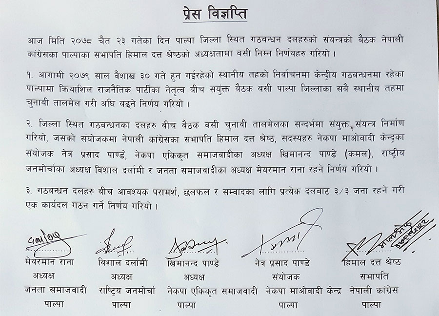 पाल्पामा पाँच दलीय गठबन्धनबीच चुनावी तालमेल