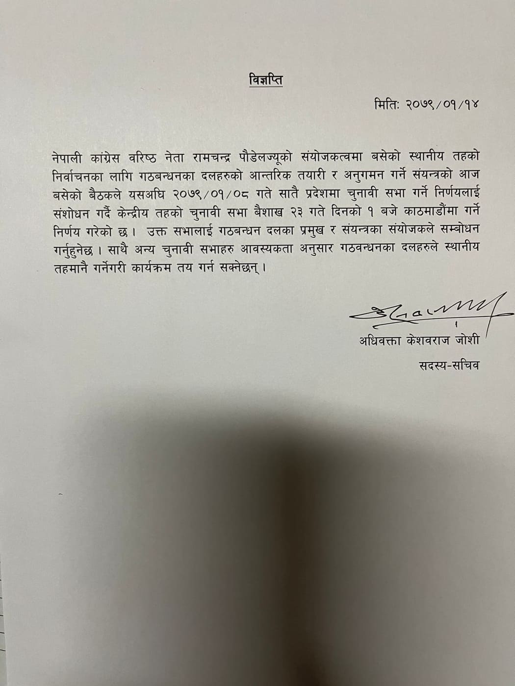 सभा वैशाख २३ गते दिनको १ बजे काठमाडौंमा गर्ने निर्णय भएको सदस्य सचिव अधिवक्ता केशवराज जोशीले जारी गरेको विज्ञप्तिमा जनाइएको छ ।