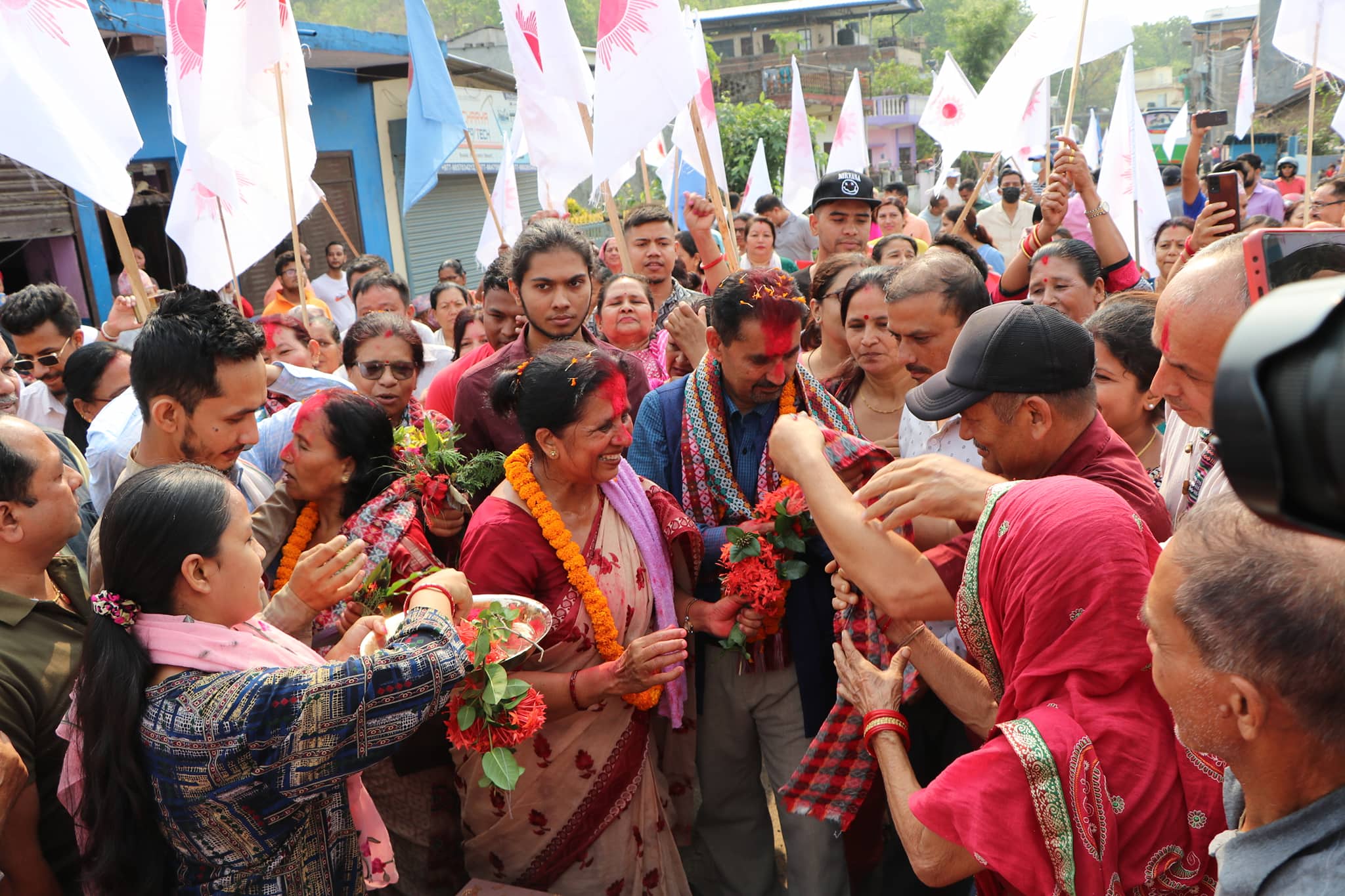 बुटवलको समृद्धिमा एमालेले अगाडी सारेका नारा लेखिएका व्यानर र झण्डा बोकेर घर आँगनमा पुगेका उम्मेदवारहरुलाई जेष्ठ नागरिकहरुले टीका र फुल लगाईदिएर जितको शुभकामना दिएका थिए ।