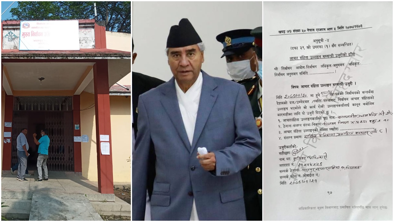 नेपाली कांग्रेसका सभापतिसमेत रहेका देउवाले निर्वाचन आचारसंहिता उल्लंघन गर्दै चुनावी सभामा सहभागी हुन भरतपुर आउन लागेको भन्दै उजुरी परेको हो ।