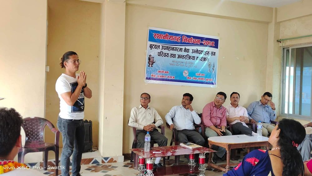 बुटवल । स्थानिय निर्वाचन २०७९ मा बुटवल उपमहानगरपालिकामा विधिन्न पार्टीबाट उम्मेदवार बनेका नेवाः समुदायका उम्मेदवारहरुले नेवाः भाषा, संस्कृति र सम्पदाको संरक्षणमा इमान्दार बन्ने प्रतिबद्धता व्यक्त गरेका छन् । नेवाः सेवा समिति बुटवलको संयोजन तथा नेवास् पत्रकार समाजको आयोजनामा बुटवलमा भएको परिचय अन्तरक्रिया कार्यक्रममा सहभागी भएका नेवा उम्मेदवारहरुले आफुहरुले चुनाव जिते भाषा, संस्कृतिको सम्बर्धन गर्न क्रियाशिल हुने प्रतिबद्धता व्यक्त गरे ।