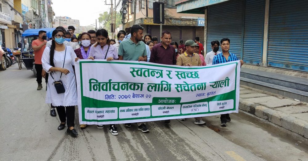 बुटवल । स्थानिय निर्वाचन २०७९ लाई स्वच्छ र शान्तिपुर्ण बनाउन मानव अधिकारवादी पाँच संघसंस्थाहरुले बुटवलमा दबाबमुलक रयालि निकालेका छन् । नेपाल पत्रकार महासंघ रुपन्देही, मानव अधिकार तथा शान्ति समाज रुपन्देही, चादनी नेपाल रुपन्देही, सामाजिक परिवर्तन केन्द्र र सेतो गुरास रुपन्देहीको संयुक्त आयोजनामा विहिबार बुटवलमा सचेतनामुलक रयाली निकालेको हो ।