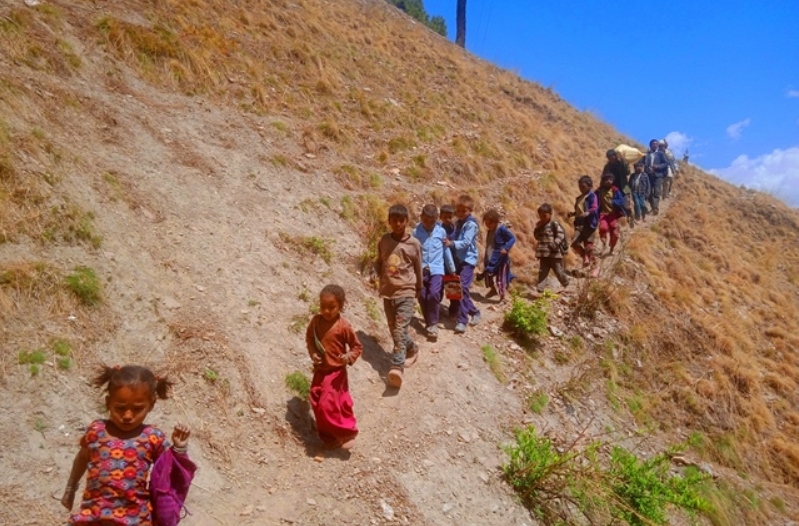 मुगु । मुगुको एक विद्यालयका विद्यार्थी जोखिम यात्रा गरेर विद्यालय पुग्न बाध्य भएका छन् ।