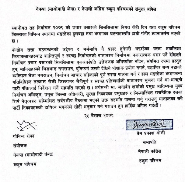 कांग्रेस रुकुम पश्चिम संयोजक प्रेमप्रकाश ओली र माओवादी संयोजक गोविन्द रोकाले संयुक्त विज्ञप्ति जारी गरी निर्वाचन आचारसंहिताको पूर्ण पालना गर्न र झडप रोकेर जिल्लाभर मैत्रीपूर्ण र स्वच्छ प्रतिस्पर्धाको वातावरण सिजर्ना गर्ने सहमति भएको जनाएका हुन् ।