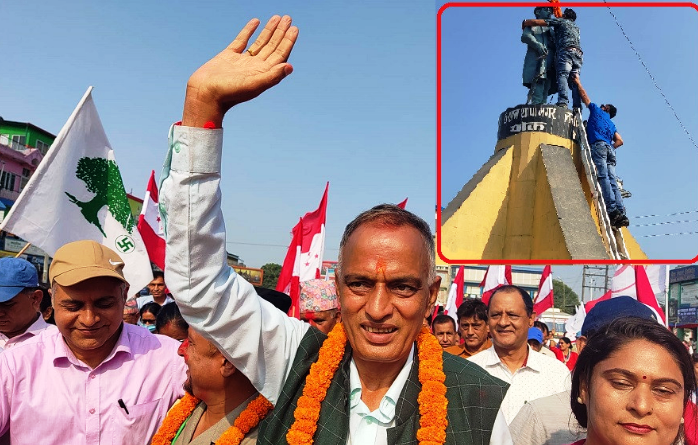 मत तान्ने अनेक उपाए, ओलीले अपमान गरेको लखन थापाको सालिकमा माल्यार्पण गर्न पुगे खेलराज