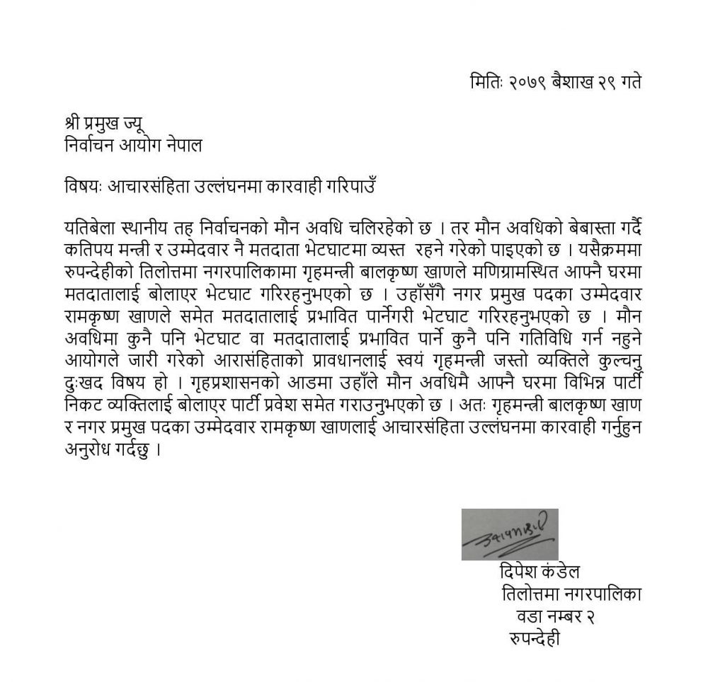 रुपन्देहीको तिलोत्तमा नगरपालिका वडा नम्बर २ का दिपेश कंडेलले गृहप्रशासनको आडमा गृहमन्त्री जस्तो व्यक्तिले आचारसंहिता विपरित गतिविधि गरेको भन्दै मन्त्री खाण र काँग्रेस उम्मेदवार रामकृष्ण खाणमाथि कारवाहीको माग गरेका हुन् ।