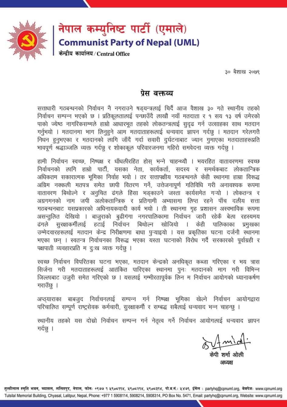 स्थानीय तहको निर्वाचन सकिएपछि एक विज्ञप्ति जारी गर्दै ‌ओलीले सत्ता गठबन्धनको निर्वाचन नै नगराउने षड्यन्त्रलाई चिर्दै आज वैशाख ३० गते स्थानीय तहको निर्वाचन सम्पन्न भएको उल्लेख गरेका छन् ।