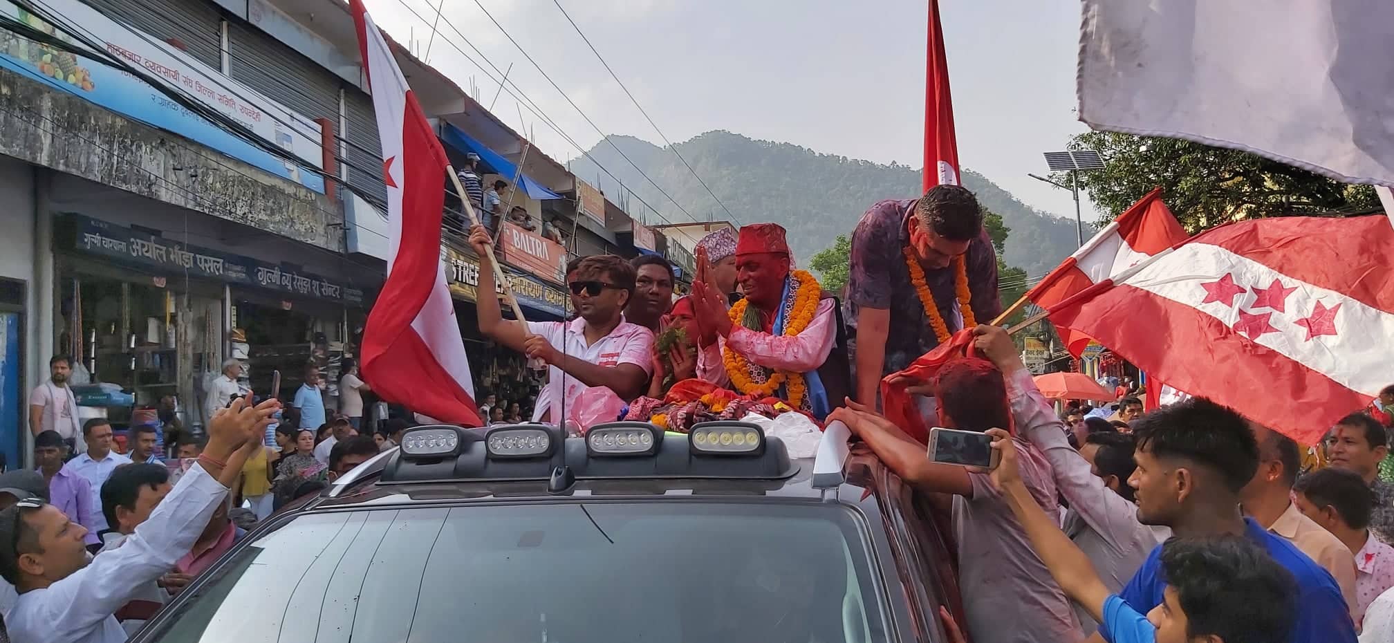 ¥यालीमा निस्केका पाण्डे सवार गाडीमा कांग्रेस र गठबन्धन समर्थकहरुले घरको बार्दली र झ्यालबाट फुल बर्साएका थिए ।
