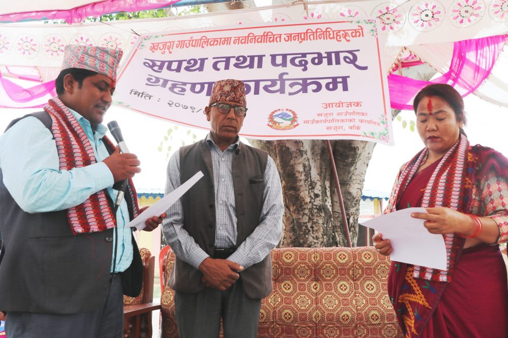 खजुरा । बाँकेको खजुरा गाउँपालिकाका नवनिर्वाचित उपाध्यक्ष मन्जु मल्ल, वडा अध्यक्ष र वडा सदस्यहरुले सपथ ग्रहण गरेका छन् । खजुरा गाउँपालिका अध्यक्ष डम्बर विक तुफानले नवनिर्वाचित खजुरा गाउँपालिकाका ८ वटा वडा अध्यक्ष र सदस्यहरुलाई कार्यालय परिसरमा सपथ ग्रहण गराएका थिए ।