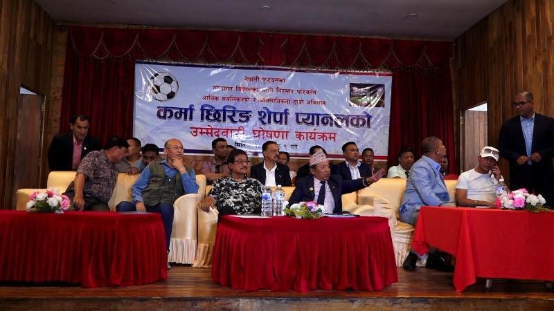 अध्यक्ष पदमा उम्मेदवारी घोषणा गर्दै एन्फाका वर्तमान अध्यक्ष कर्माछिरिङ शेर्पाले पछिल्लो चार वर्षे कार्यकालमा आफूलाई विकासको पक्षमा काम गर्न बाधा हाल्ने काम भएको र अहिले चुनावमा पनि विभिन्न आरोप लगाउँदै आपूmविरुद्ध लागेको बताए । पछिल्लो कार्यकालमा गरेका कामको नालिबेलीका साथै आगामी कार्यकालमा गर्ने कामको घोषणापत्र समेत सार्वजनिक गर्दै एन्फा अध्यक्ष शेर्पाले कोभिड महामारीका कारण सोचेअनुसार काम गर्न भने नपाएको स्वीकार गरे । अध्यक्ष शेर्पाले फुटबल विकासमा लागि रहँदा केही तत्वहरुले रोक्ने प्रयास गरेको र फुटबललाई घर चलाउने माध्यम नबनाओस भनेर आपूmले उम्मेदवरी दिन लागेको जिकिर गरे ।