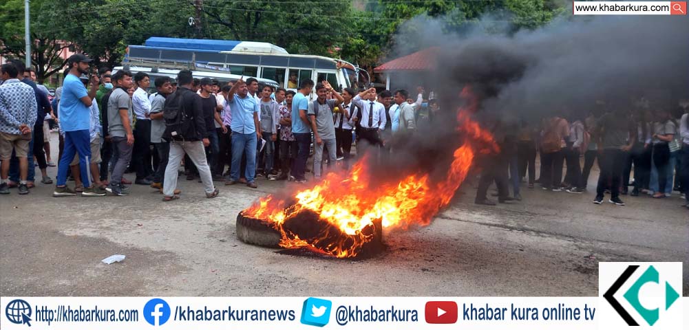 बहुमुखी क्याम्पस अगाडि सडकमा जम्मा भएका अनेरास्ववियुका कार्यकर्ताले यातायात बन्द गर्नुका साथै टायर बालेर नाराबाजी गरि रहेका छन् ।