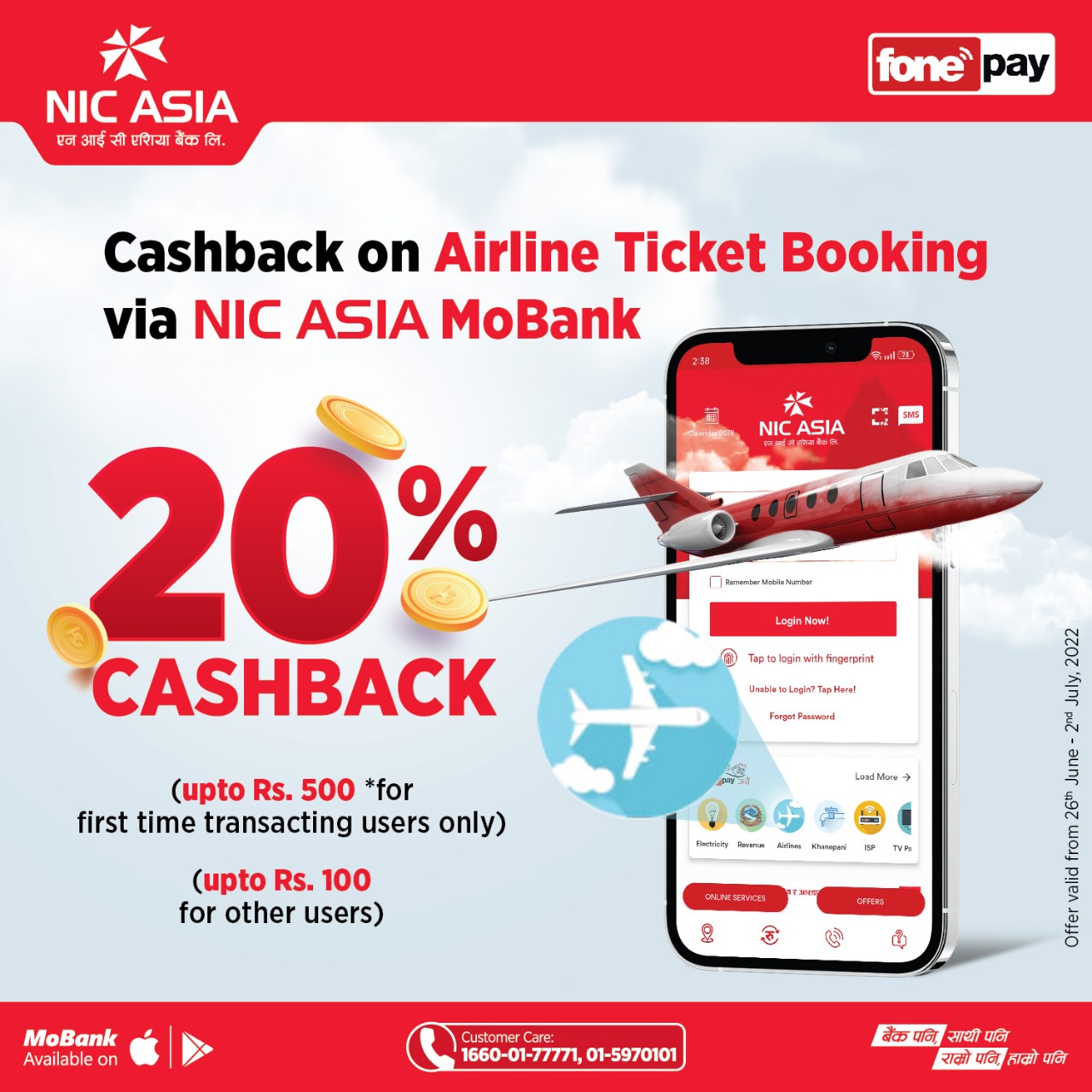 बैंकले डिजिटल बैंकिङ्गको प्रबद्र्धन गर्नका लागि आफ्नो मोबाइल बैंकिङ्ग एप मार्फत विभिन्न एयरलाइनको टिकट बुकिङमा २० प्रतिशत सम्म क्यास व्याक हुने आकर्षक योजना सार्वजनिक गरेको हो ।